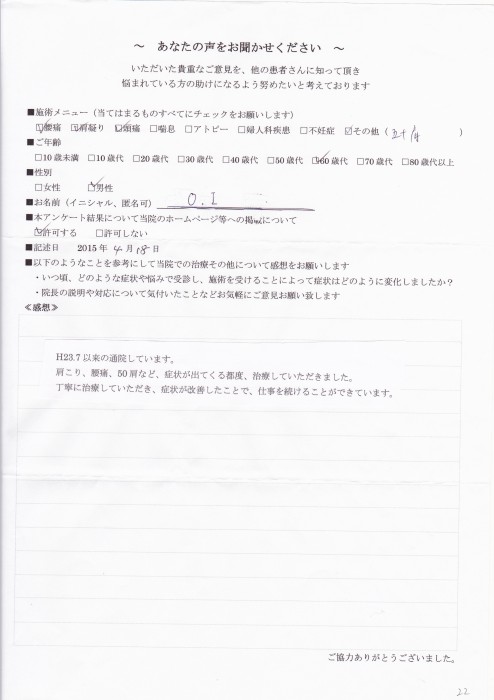 鍼灸・AOIに通院してくださっている患者様にアンケートをお願いしてご協力いただきました。